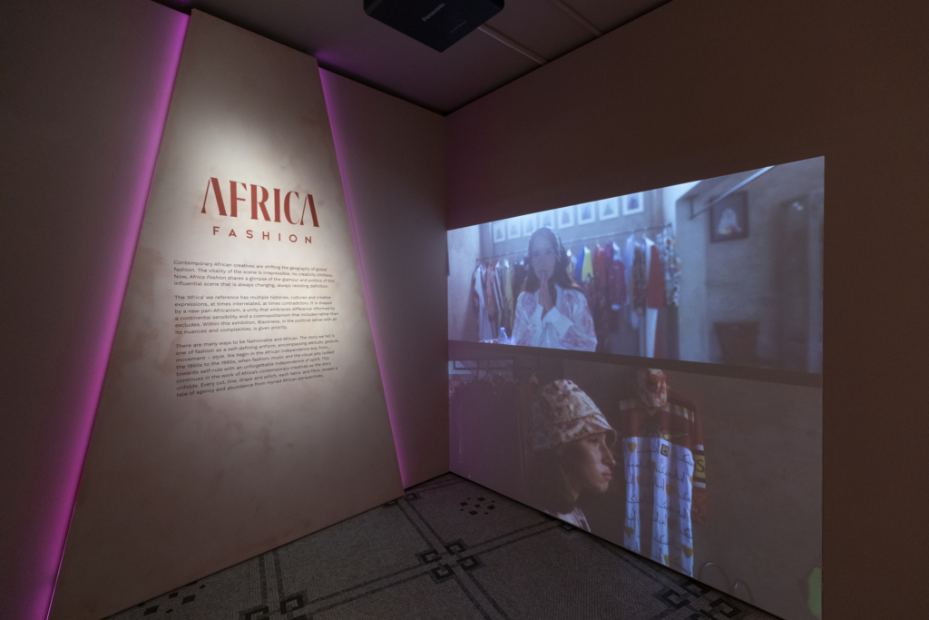 In the final section of the exhibition, the dancing models I had glimpsed at the beginning were now bigger and closer, their braids and twists swift and mobile as they bounced and posed for their hidden friend behind the camera. John Cena rapper Sho Madjozi’s interpretation of the Xibelani (a traditional XiTsonga skirt) stood alongside the elaborate, patterned two-piece Tokyo James suit worn by Nigerian singer Burna Boy. Here, we were firmly positioned in the present of fashion in Africa, where artists and celebrities model creativity and luxury, just as in the rest of the world.